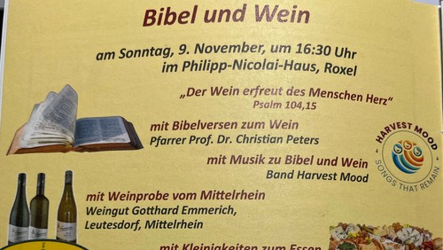 "Der Wein erfreut des Menschen Herz" (Psalm 104,15). Das wurde reichlich ausprobiert. Mehr als 50 Teilnehmende kamen am Sonntag 9. November, um 16:30 Uhr im Philipp-Nicolai-Haus in Roxel zusammen und genoßen folgende