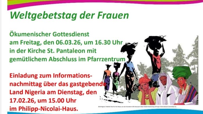 Herzliche Einladung zum Ökumenischen Gottesdienst am Freitag, den 06.03.26, um 16.30 Uhr in der Kirche St. Pantaleon mit gemütlichem Abschluss im Pfarrzentrum